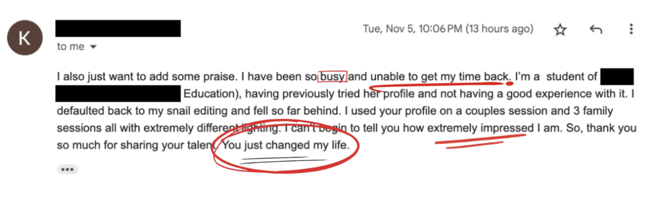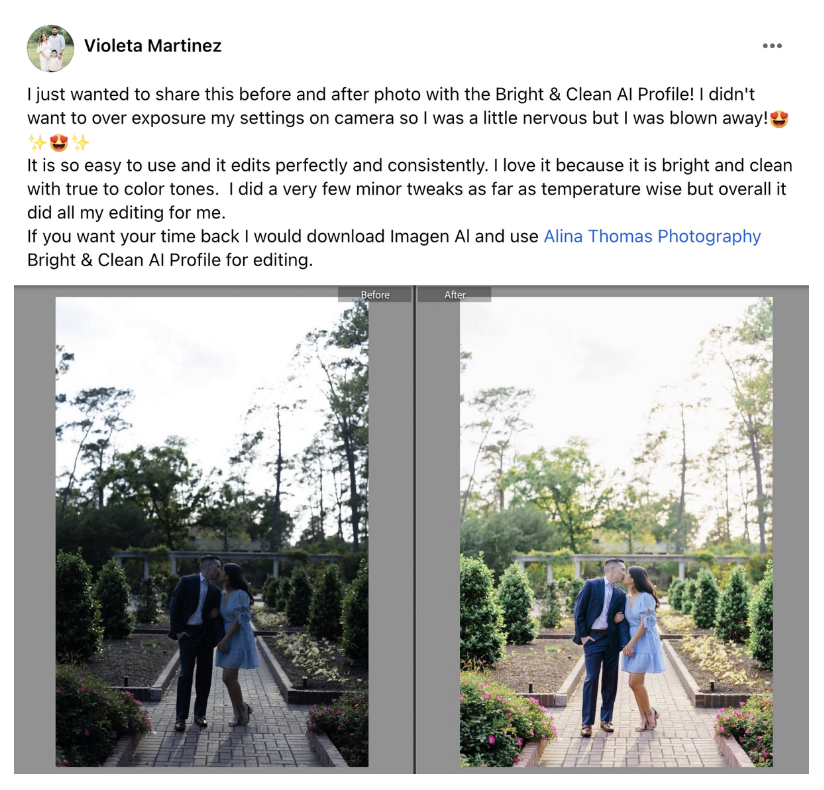 "The Bright & Clean Imagen AI Profile has saved me countless hours in front of the computer. Without it, I would have never been able to finally find the bright and clean edits I have been looking for. I just wanted nice light with clean and simple colors and couldn't quite find it until now."